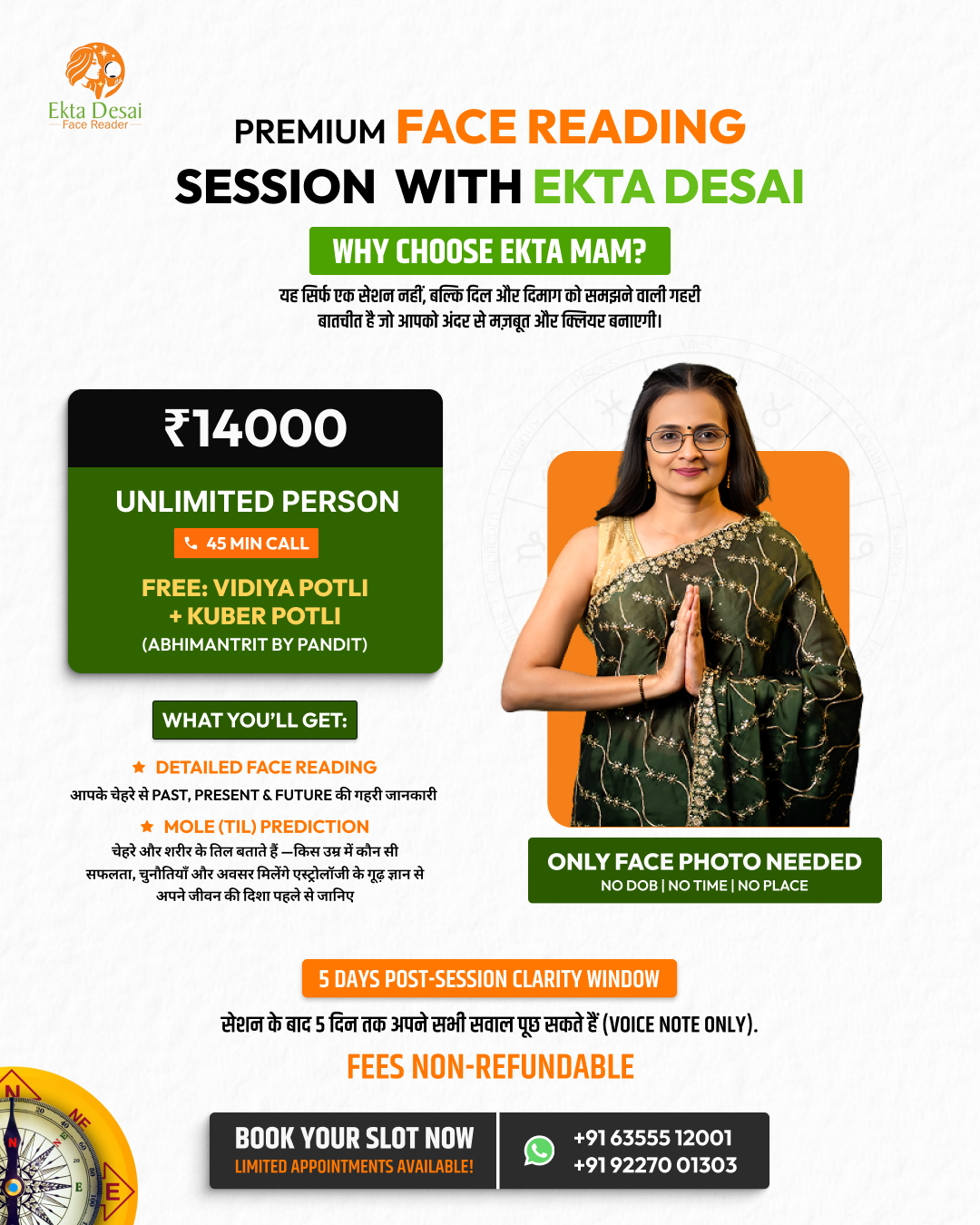 Ekta Desai analyzes facial structure, proportions, and feature alignment from a single photograph to provide practical, present-moment insights—without using astrology or birth charts.
